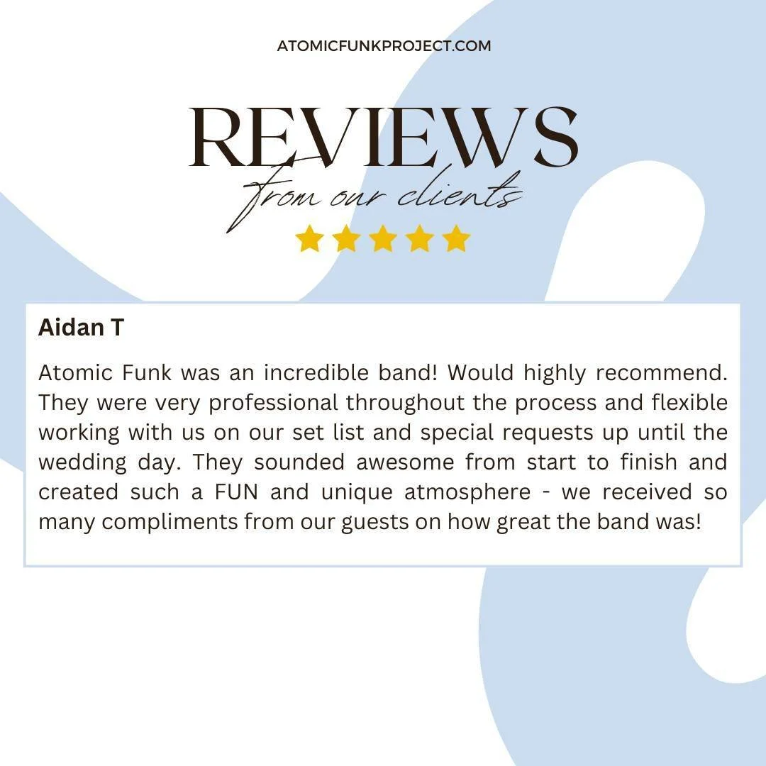 “They played our wedding in upstate New York and it was truly the element that made our event soar. I had fears after attending weddings in the past and having the band bring down the mood or feel a little corny... Our entire wedding could not stop talking about how amazing Atomic Funk Project was, they were the talk of the weekend. The musicians, the vocalists, the emcee, all of it was phenomenal.” -David